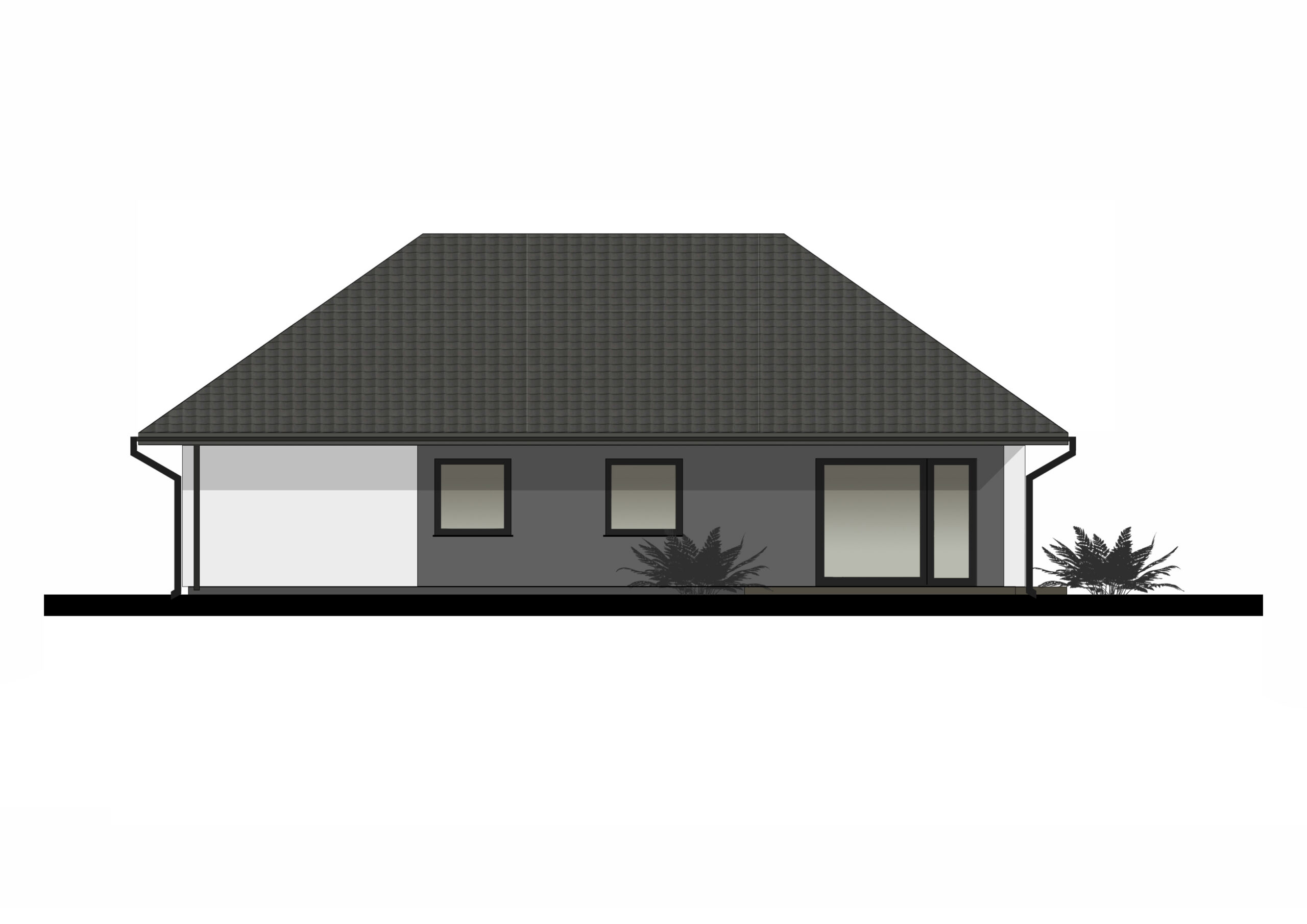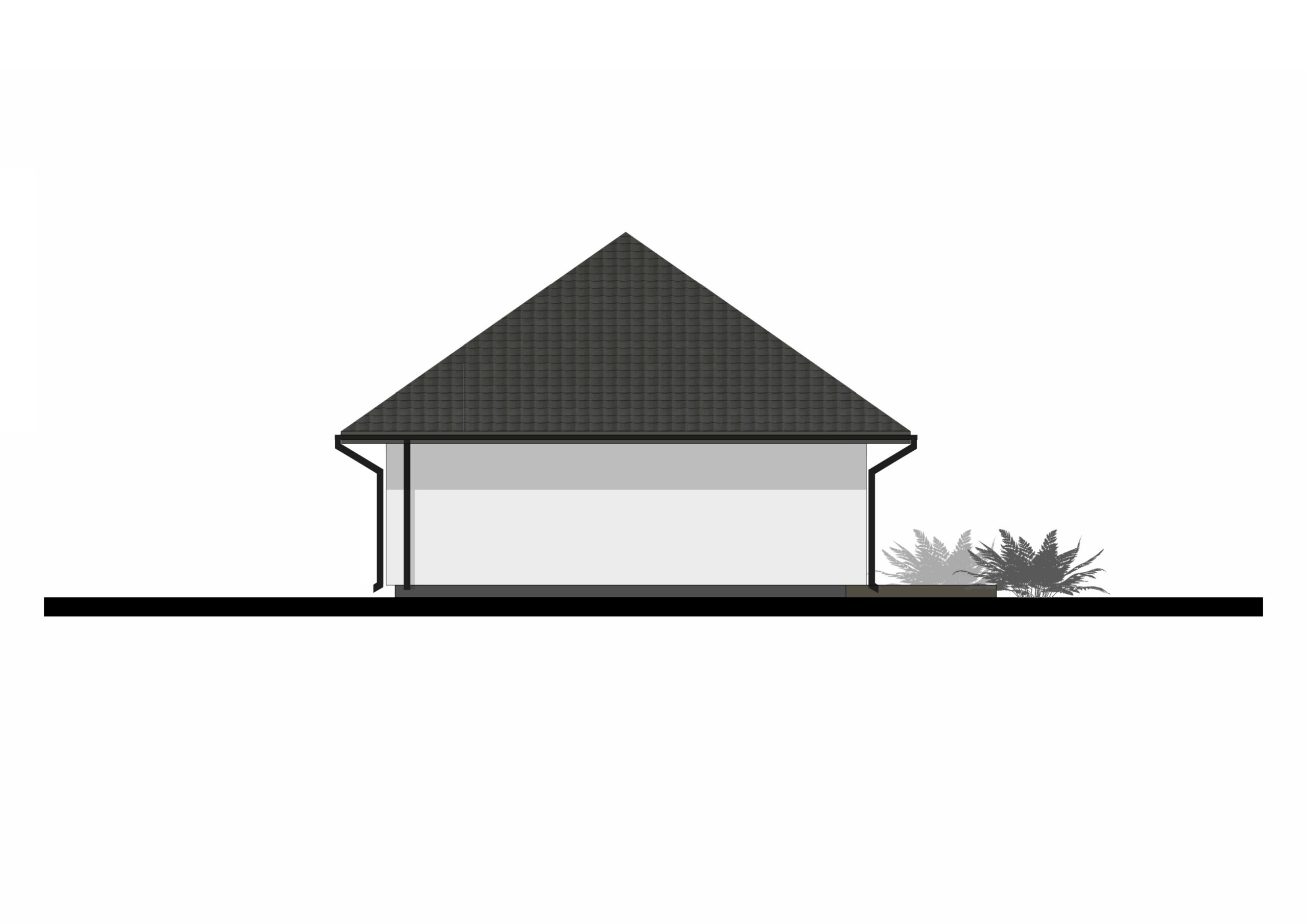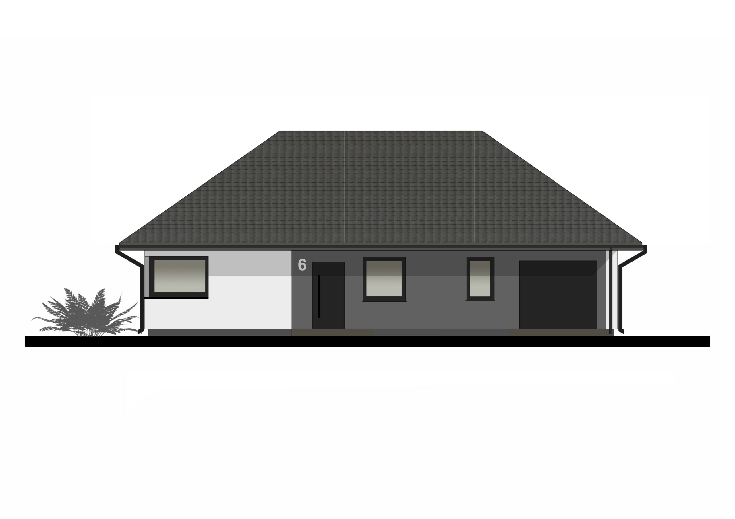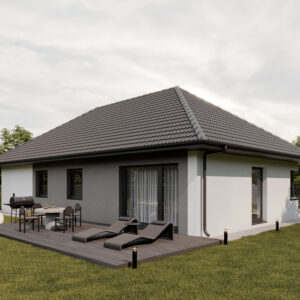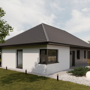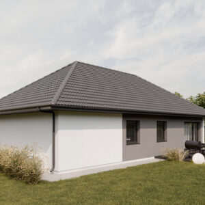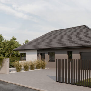 Projekt wyróżnia się przemyślanym układem pomieszczeń, w którym nowoczesny styl łączy się z praktycznymi rozwiązaniami. Bezpośrednie połączenie garażu z częścią mieszkalną znacząco podnosi komfort użytkowania – rzadko spotykane w kompaktowych domach parterowych. Salon z jadalnią i otwartą kuchnią tworzy przytulne centrum domu. Trzy wygodne sypialnie oraz osobna garderoba gwarantują przestrzeń i prywatność, natomiast spiżarnia przy kuchni oraz pomieszczenie techniczne czynią codzienne funkcjonowanie wyjątkowo wygodnym. To dom, który wyróżnia się harmonią, nowoczesnym charakterem i niepowtarzalną dbałością o detale.