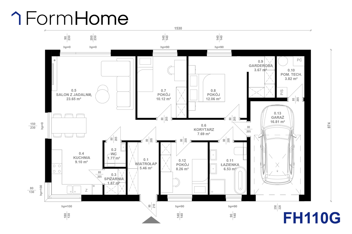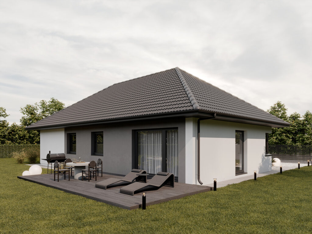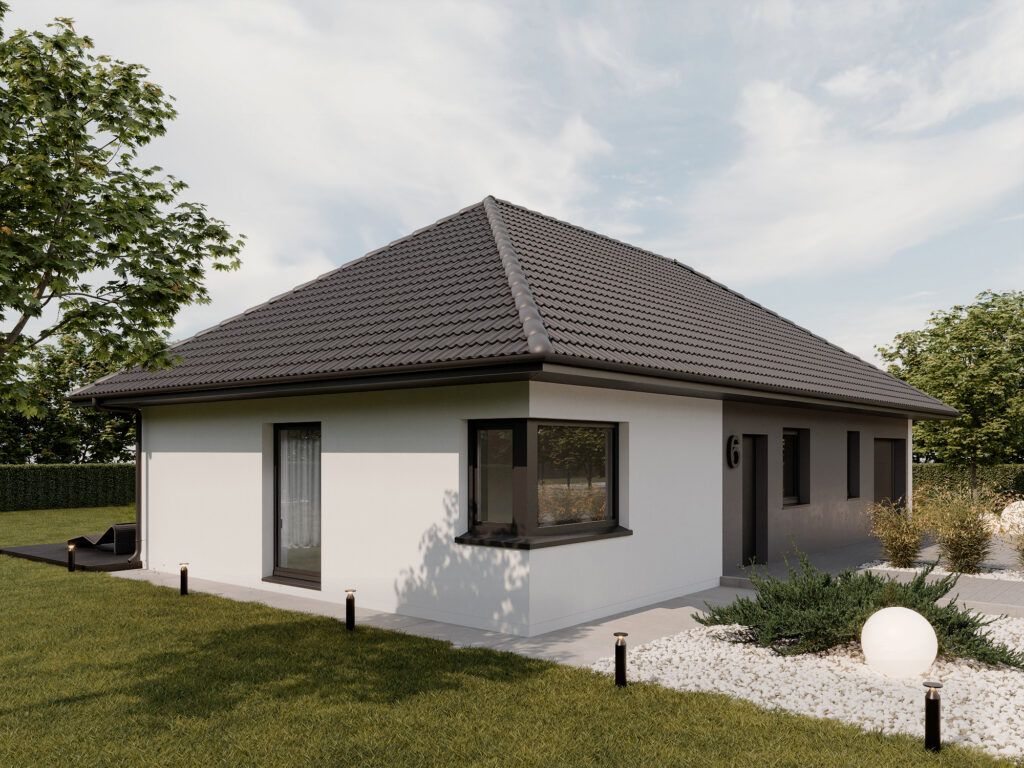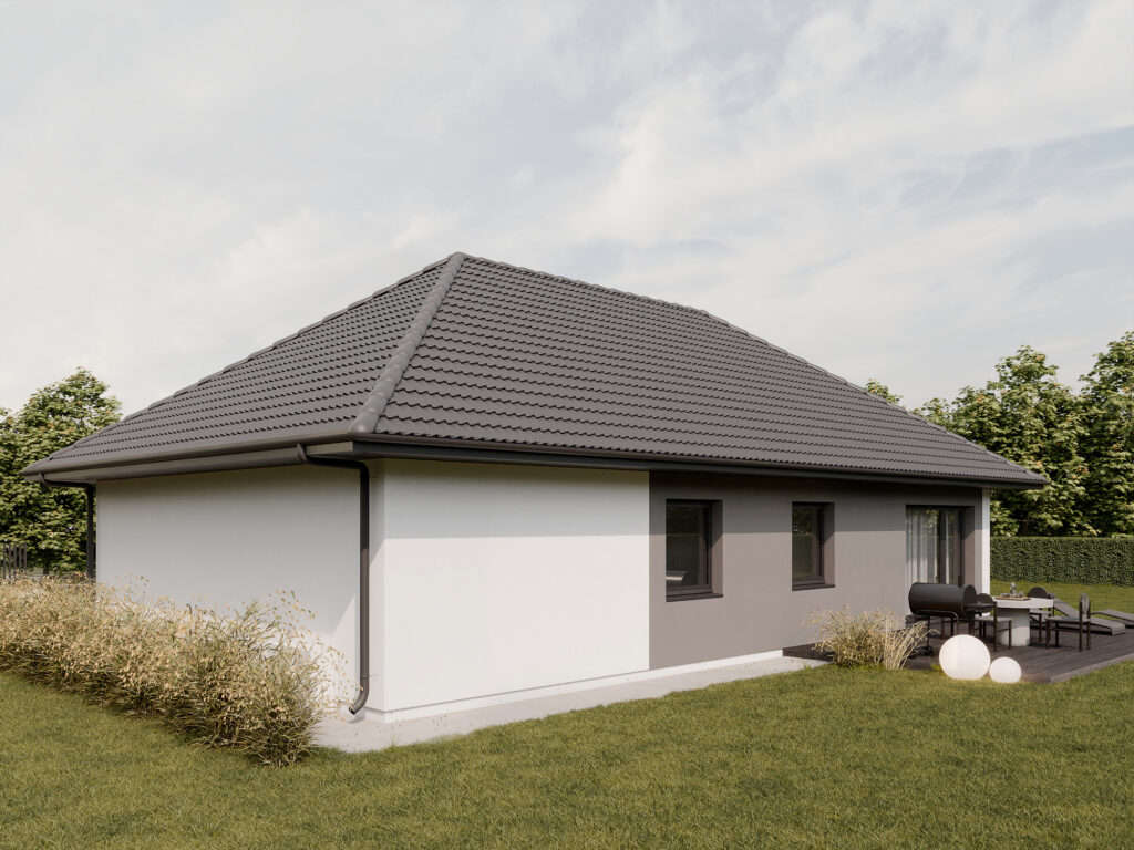 Projekt wyróżnia się przemyślanym układem pomieszczeń, w którym nowoczesny styl łączy się z praktycznymi rozwiązaniami. Bezpośrednie połączenie garażu z częścią mieszkalną znacząco podnosi komfort użytkowania – rzadko spotykane w kompaktowych domach parterowych. Salon z jadalnią i otwartą kuchnią tworzy przytulne centrum domu. Trzy wygodne sypialnie oraz osobna garderoba gwarantują przestrzeń i prywatność, natomiast spiżarnia przy kuchni oraz pomieszczenie techniczne czynią codzienne funkcjonowanie wyjątkowo wygodnym. To dom, który wyróżnia się harmonią, nowoczesnym charakterem i niepowtarzalną dbałością o detale.