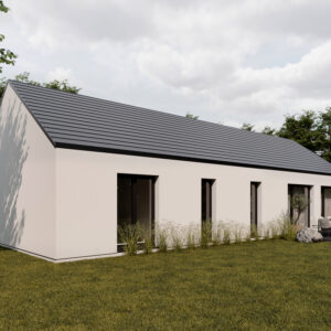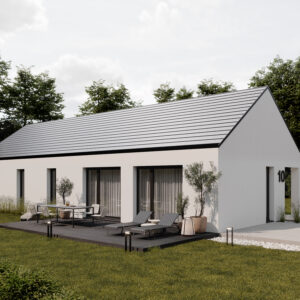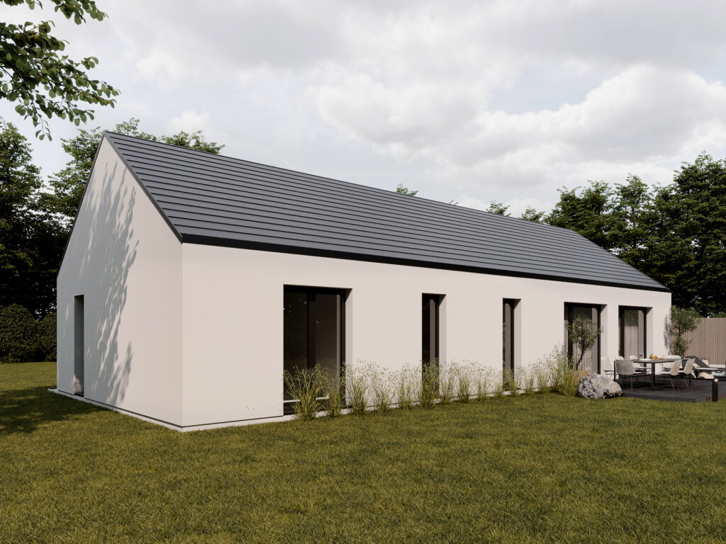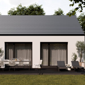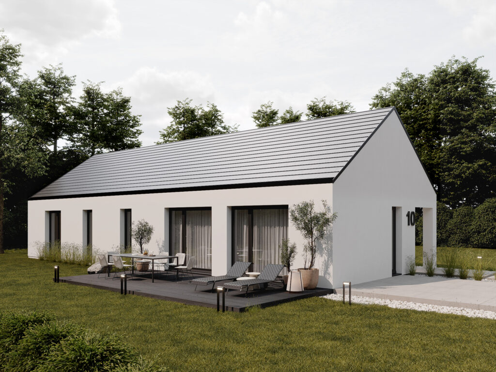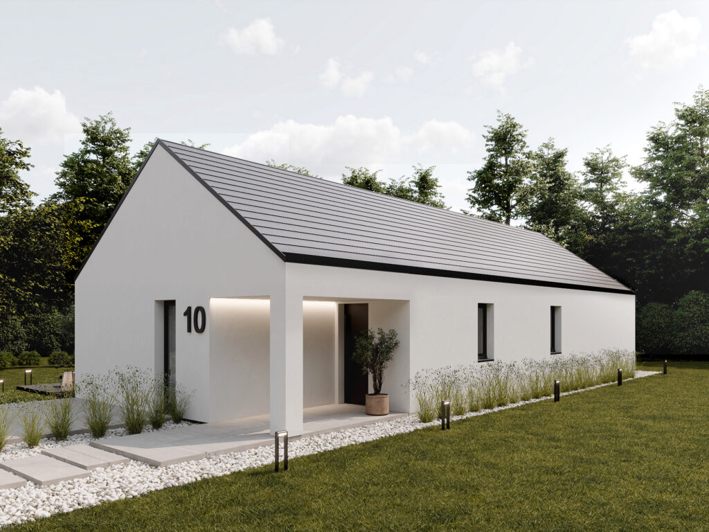 Nowoczesny projekt domu w stylu stodoły to idealna propozycja dla osób szukających komfortowej przestrzeni dla rodziny. Jasna strefa dzienna z przestronnym salonem ze względu na wysoki sufit, jadalnią i otwartą kuchnią tworzy przyjazne miejsce do relaksu. W części prywatnej znajdują się aż cztery pokoje, które można dowolnie zaaranżować – jako sypialnie, pokój dziecka, gabinet czy pokój gościnny – dając pełną swobodę dopasowania do potrzeb domowników. Funkcjonalność podkreślają praktyczne rozwiązania, tj osobna toaleta, duża łazienka oraz wygodny wiatrołap. To dom, który łączy elegancję, ergonomię i współczesny design.