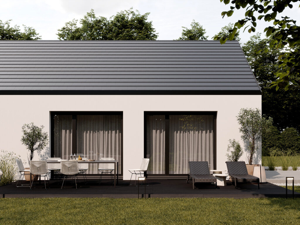 • Dach dwuspadowy z ukrytymi rynnami GALECO, pokryty dachówką CREATON
