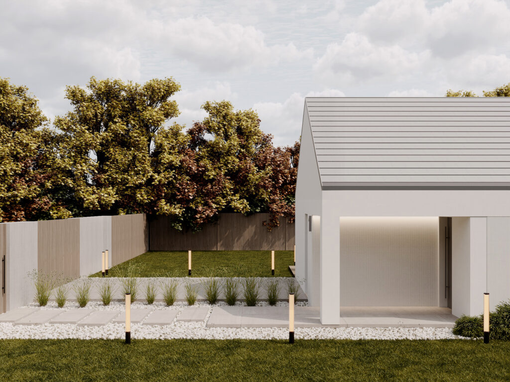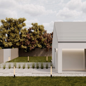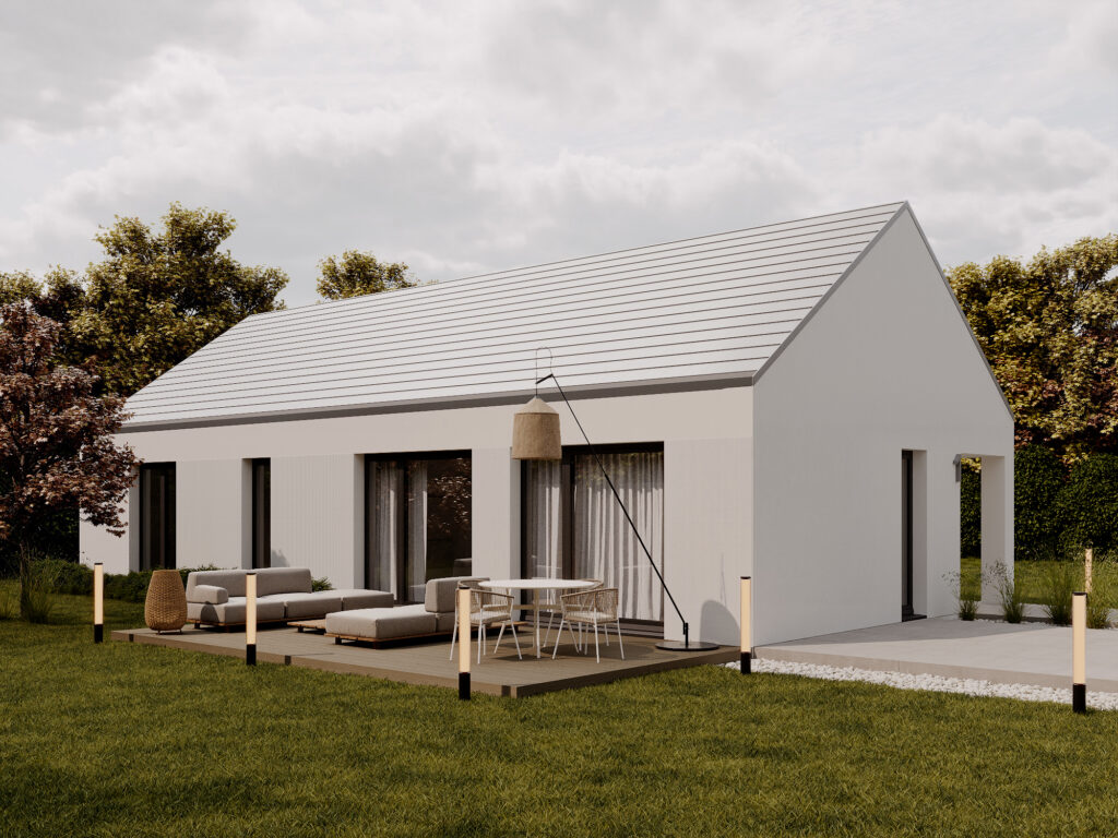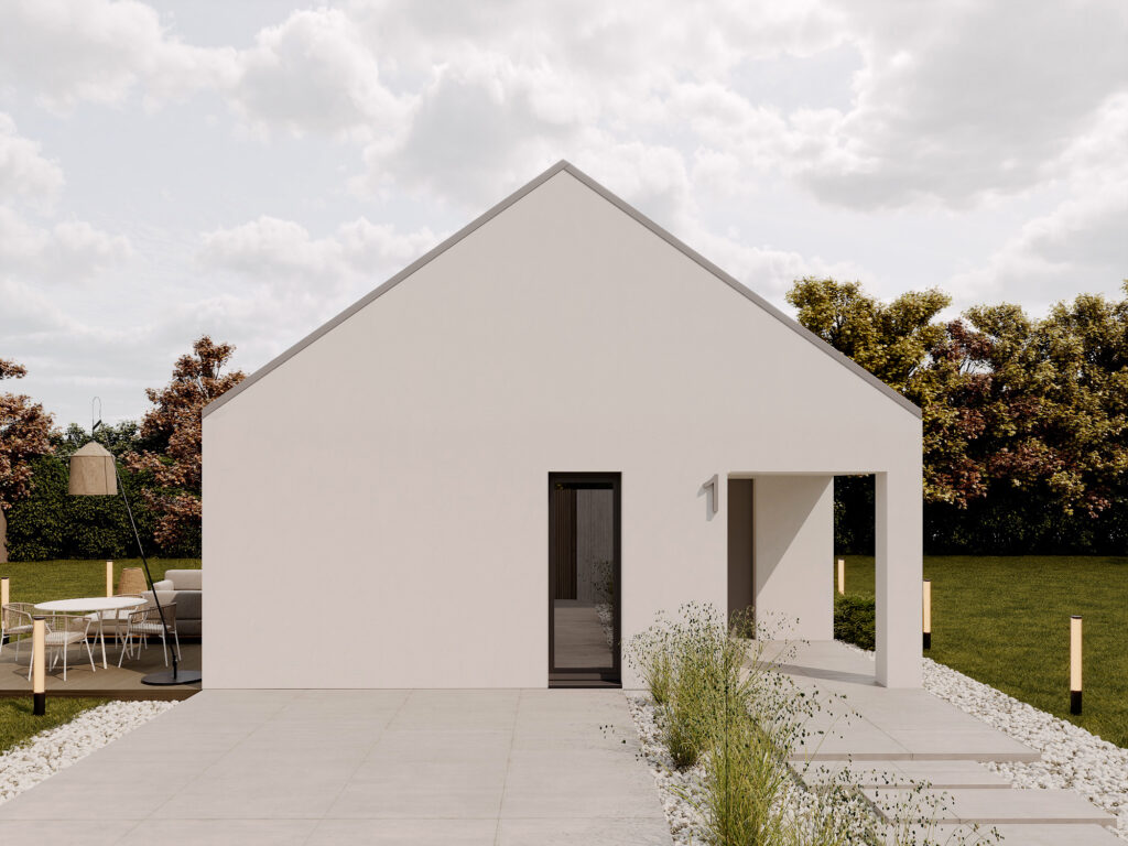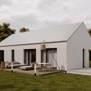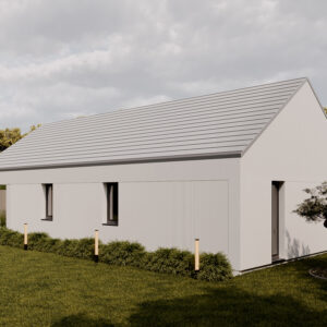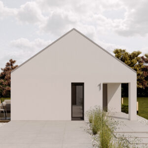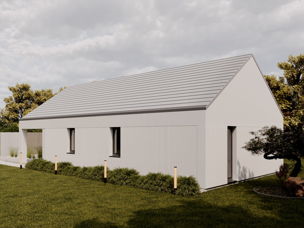 Nowoczesny dom o funkcjonalnym układzie łączy prostotę formy z przestronnością wnętrza. Inspirowany stylem nowoczesnej stodoły zachwyca otwartą przestrzenią salonu z wysokim sufitem, który dodaje wnętrzu lekkości i niepowtarzalnego charakteru. Strefa nocna obejmuje trzy przytulne sypialnie, łazienkę oraz praktyczne pomieszczenie gospodarcze. To rozwiązanie dla rodzin ceniących funkcjonalność, estetykę i nowoczesny styl życia.